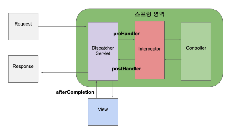 - 인터셉터는 스프링 컨테이너 내에서 동작하므로 필터를 거쳐 프론트 컨트롤러인 디스패처 서블릿이 요청을 받은 이후에 동작하게 되는데, 이러한 과정을 그림으로 표현하면 아래와 같습니다.